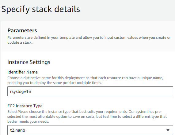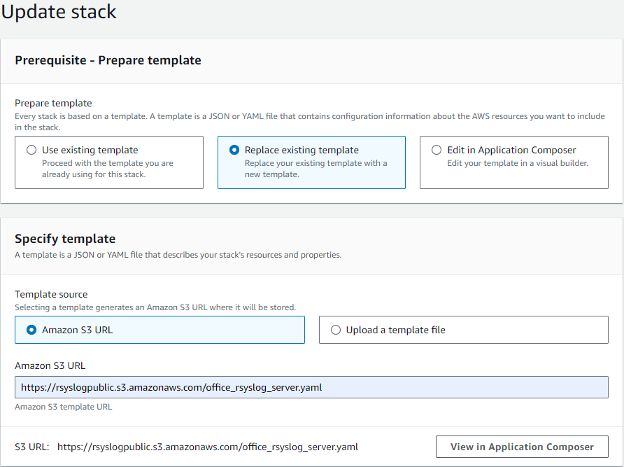 https://rsyslogpublic.s3.amazonaws.com/office_rsyslog_server.yamlAlternatively, you can use the template URL provided on the AWS Marketplace product page for the rsyslog server.
