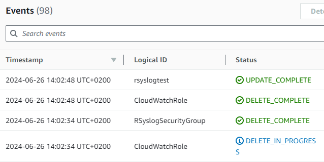 - Select Your Stack: Identify and select the CloudFormation stack for your rsyslog server. In this example, the stack is named “rsyslogtest”.