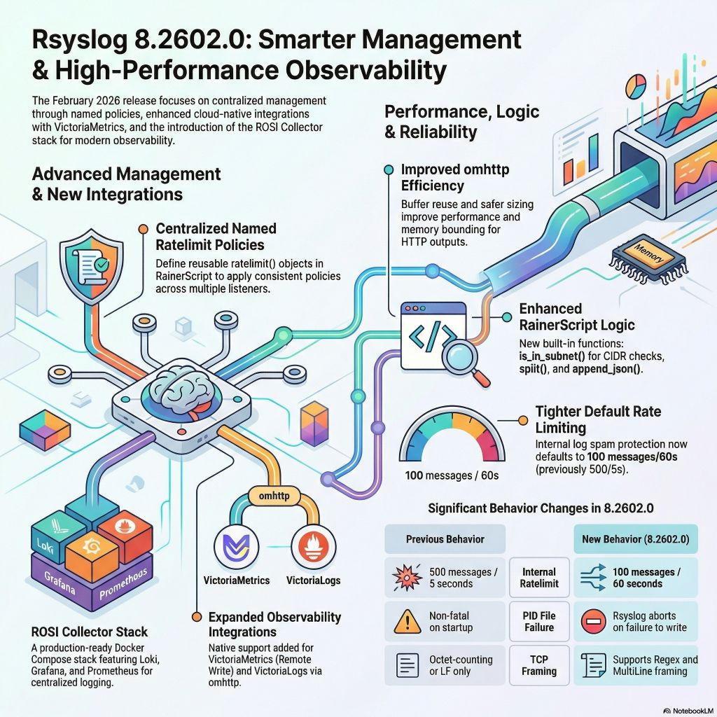 rsyslog 8.2602.0: ROSI Collector, rate-limit policies, stronger TLS, and telemetry integration